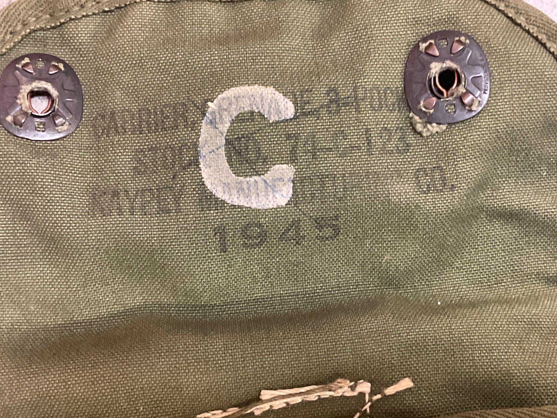 Vintage 1945 3-Pocket Grenade Carrier. O.D. Duck canvas. This one has a custom first aid patch added to the middle pouch. Used. Good condition. 11"x7", includes leg straps on bottom of pouch and belt attachment at top.