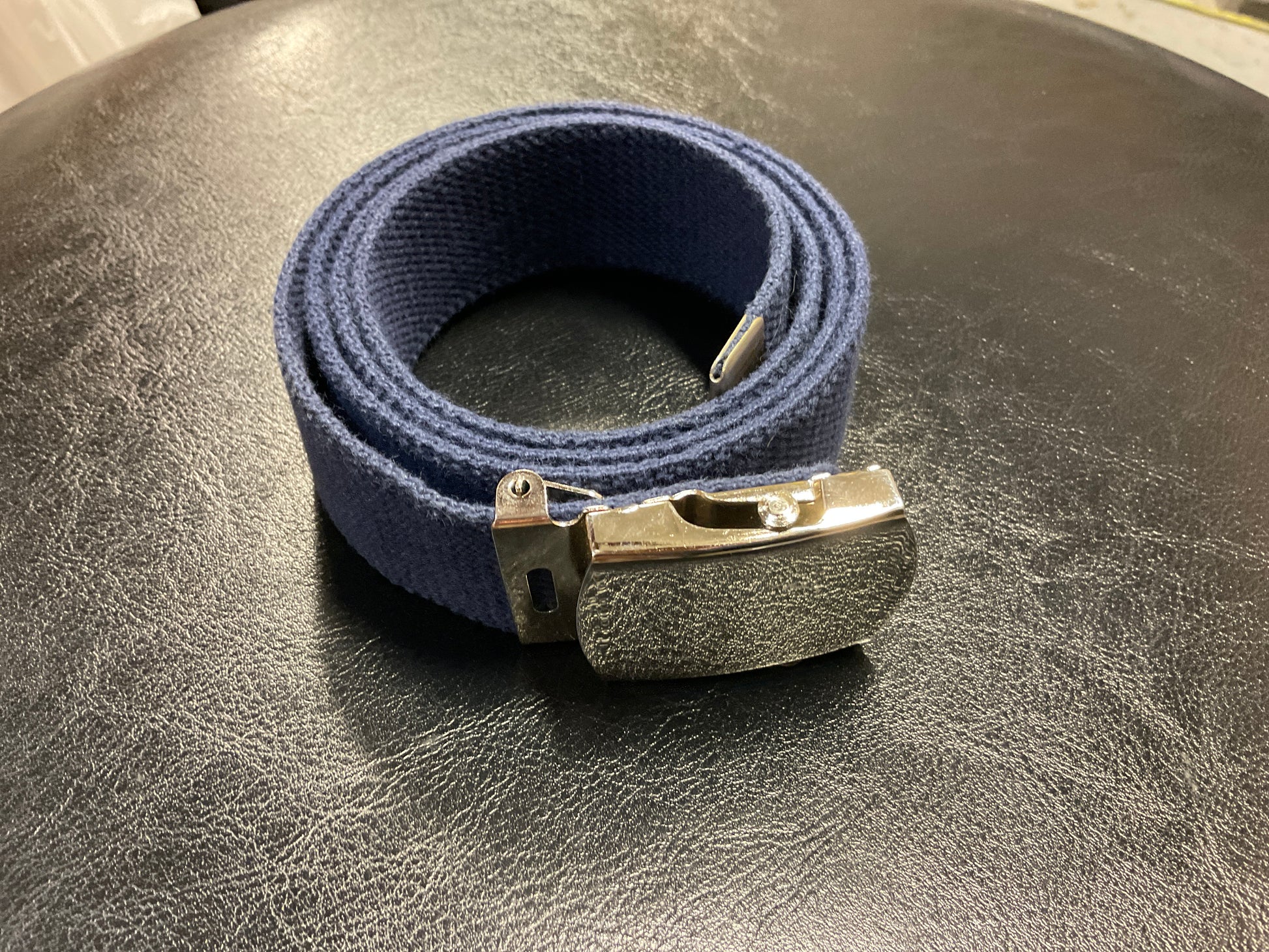 Air Force belt blue cotton web with mirror finish tip and buckle. 1 1/4"