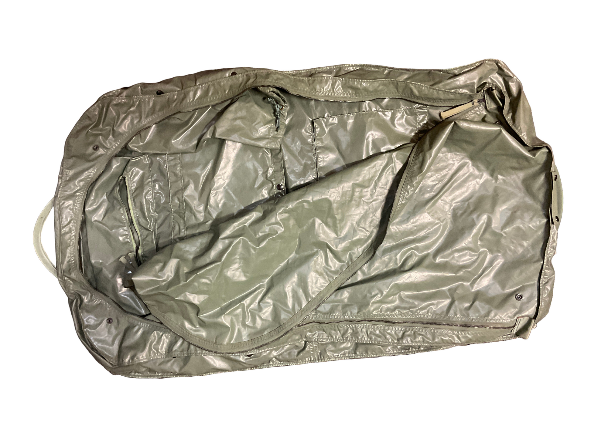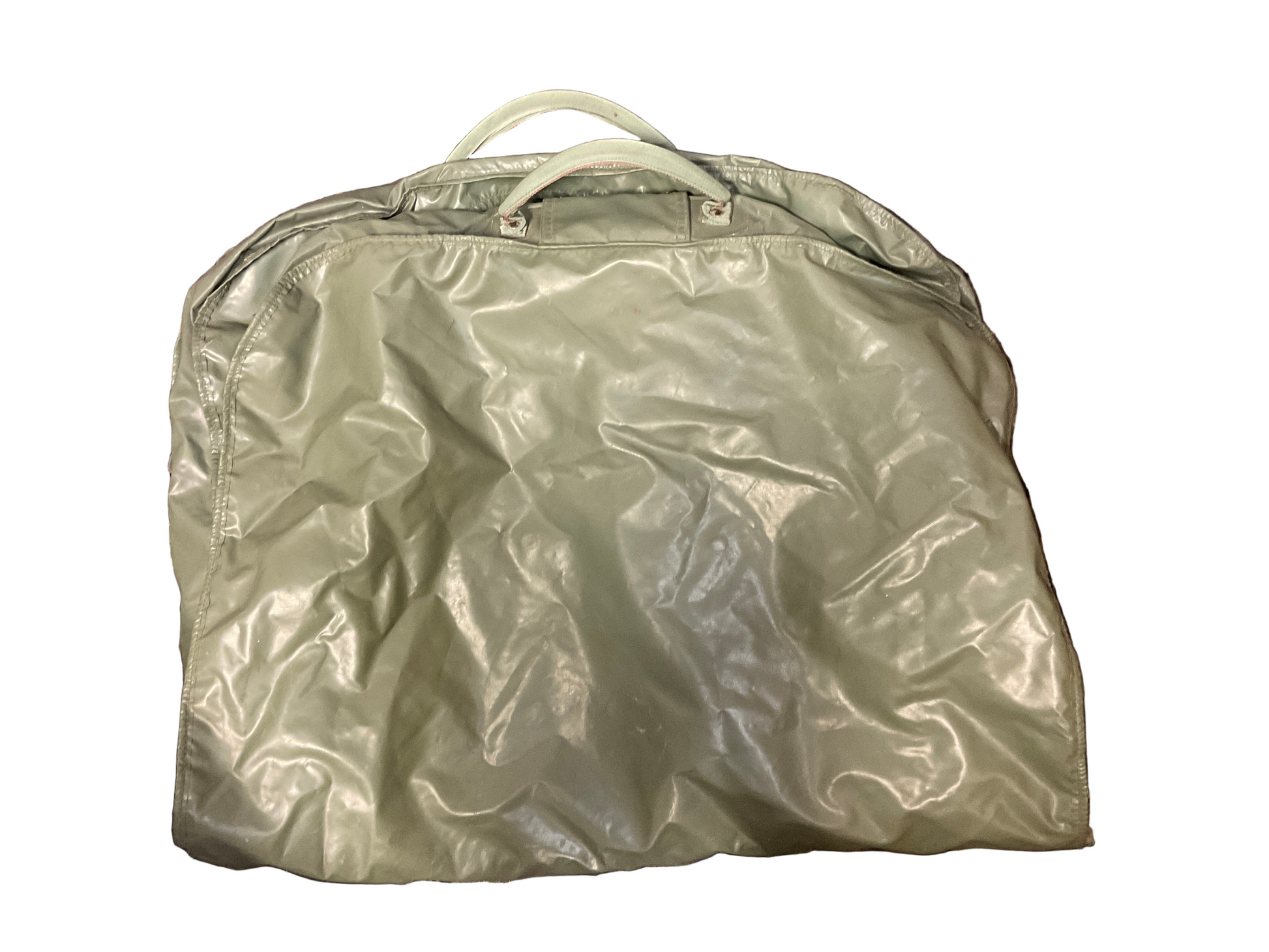 Kit Bag, Flyers, Type BGU-2P. 70’s vintage rubberized garment bag. Full zip for easy clothing storage. 2 large inner snap closure pockets and 2 draw string shoe storage pouches. Folds up for easy carrying with handles. Used, good condition.