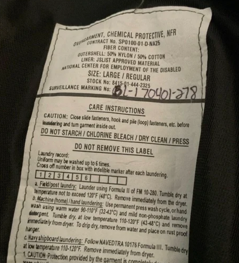 Please follow the wash instructions on the label. There is charcoal in the pant liners that will get everywhere in your washer and dryer. Made in USA. Used, good condition.